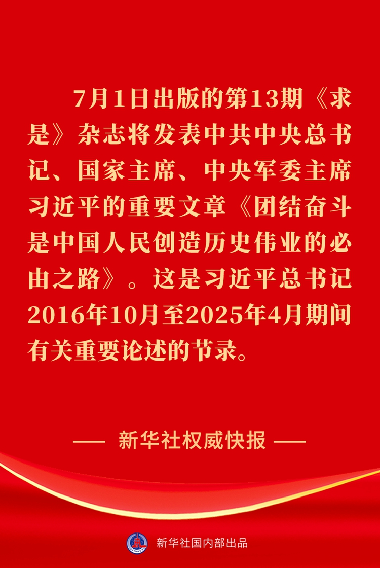 7月1日出版的第13期《求是》杂志将发表中共中央总书记、国家主席、中央军委主席习近平的重要文章《团结奋斗是中国人民创造历史伟业的必由之路》。这是习近平总书记2016年10月至2025年4月期间有关重要论述的节录。