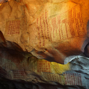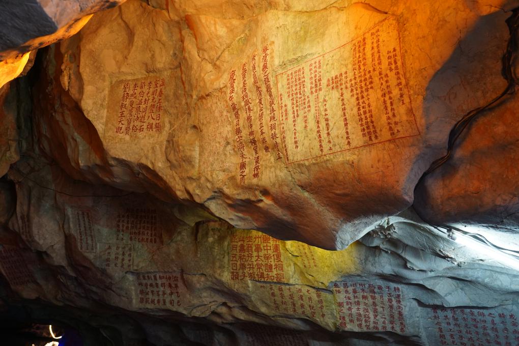 进入石室岩溶洞内,如李邕所写,各种钟乳石倒悬,犬牙交错。仰头望,岩壁布满文字,纷繁的字体、或艰涩或直白的内容、各异的文体荟萃于此。