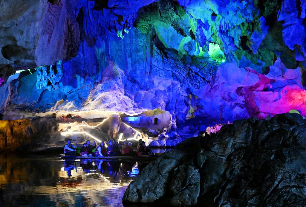 游客乘船在溶洞内参观。新华社记者 才扬 摄