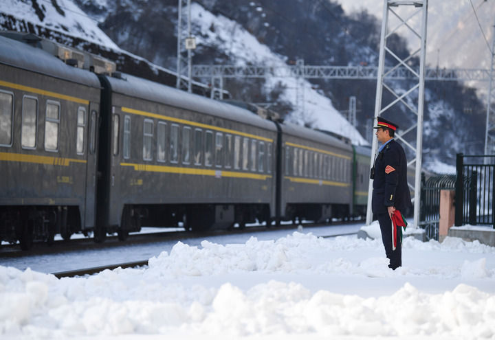 1月28日,在宝成铁路秦岭观音山车站,工作人员在站台引导列车通行。新华社记者 张博文 摄