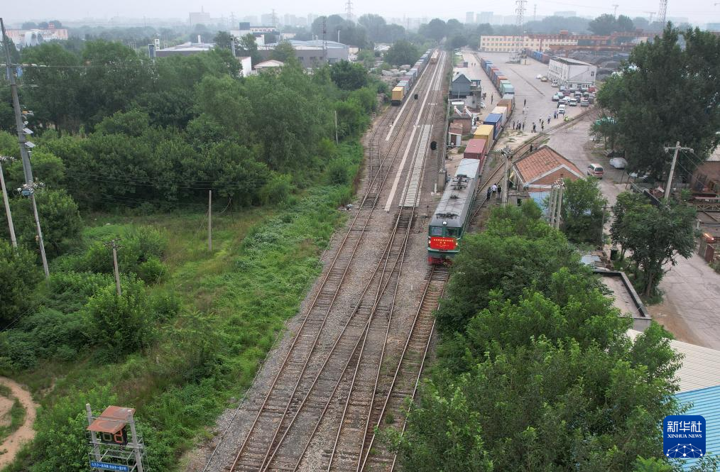 6月30日,北京至阿塞拜疆巴库的跨里海中欧班列停靠在位于北京市房山区的北京国际陆港等待发车。新华社记者 张晨霖 摄