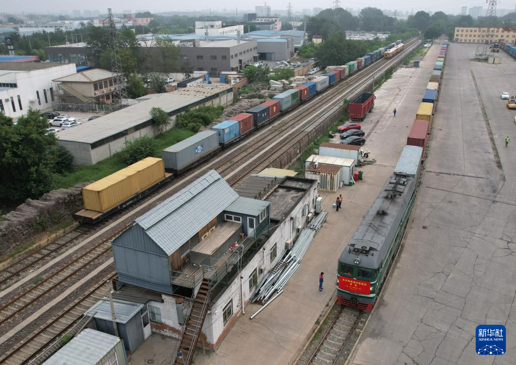 6月30日,北京至阿塞拜疆巴库的跨里海中欧班列停靠在位于北京市房山区的北京国际陆港等待发车(无人机照片)。新华社记者 张晨霖 摄