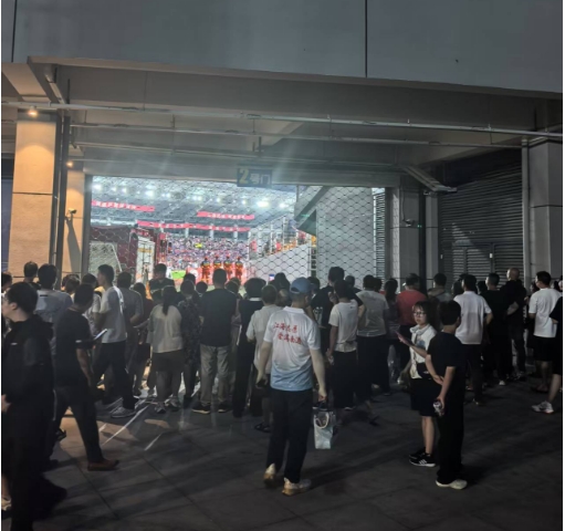 ↑每个主场外都有大量无票观众逛市集、看热闹,这是在南通主场外,不少群众聚集在出入口“管窥”比赛