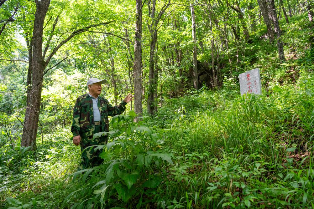 6月17日,在七星砬子抗联密营遗址内,集贤县革命老区建设促进会会长朴永鹤介绍抗联十一军军政干部学校遗址。新华社记者 谢剑飞 摄