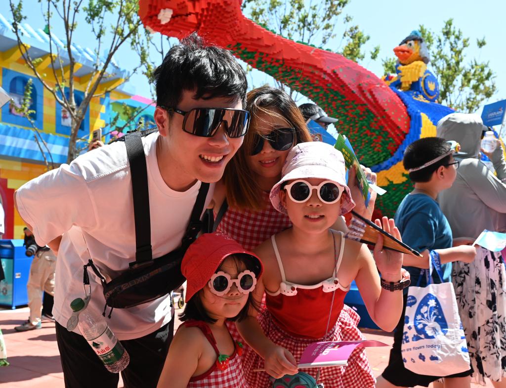 7月5日,游客在上海乐高乐园入口处附近合影。新华社记者 陈爱平 摄