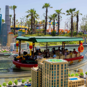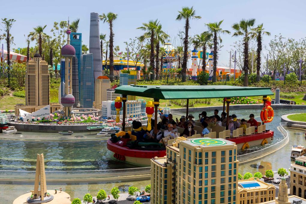 7月5日,游客乘船经过上海乐高乐园“室外迷你天地”。这片区域由乐高积木拼搭而成。 新华社记者 王翔 摄