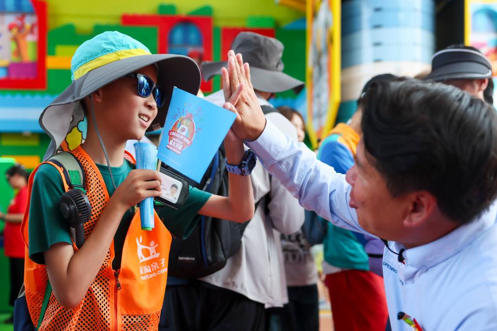 7月5日,上海乐高乐园的工作人员与入园的小游客击掌。新华社记者 王翔 摄