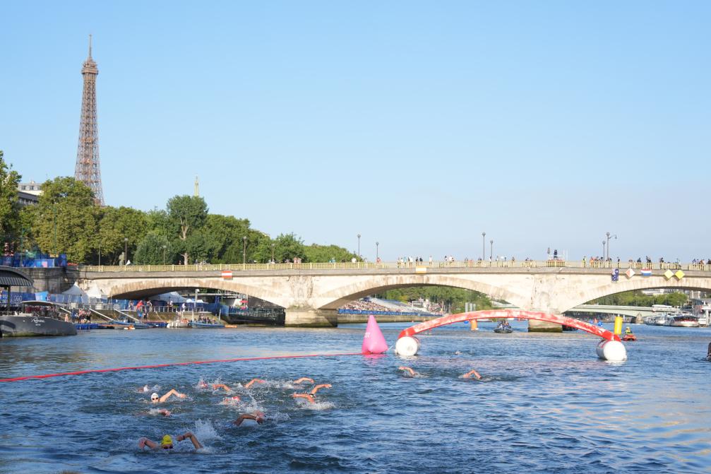 2024年7月17日,巴黎市长伊达尔戈(中右)在塞纳河中游泳,向外界展示几年来的河水净化成效。新华社记者高静摄