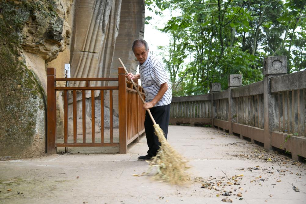 曾祥余在清扫石窟前的落叶(6月14日摄)。
