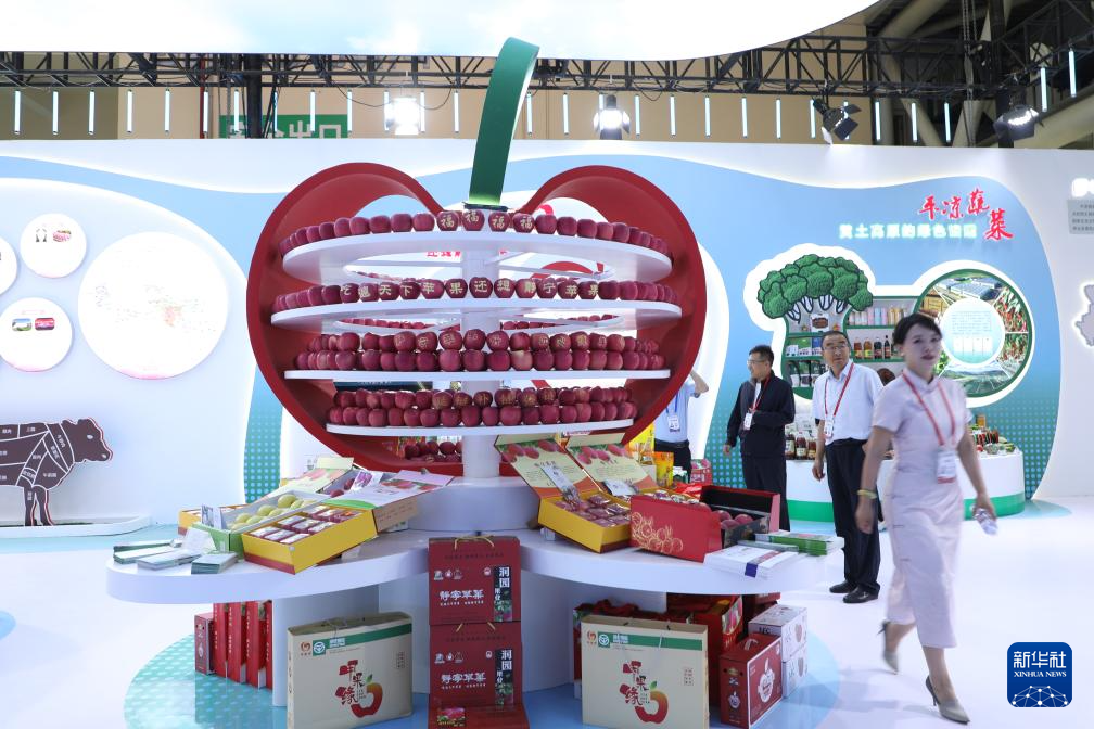 这是7月6日在兰洽会展馆内拍摄的甘肃静宁苹果展台。新华社记者 张智敏 摄