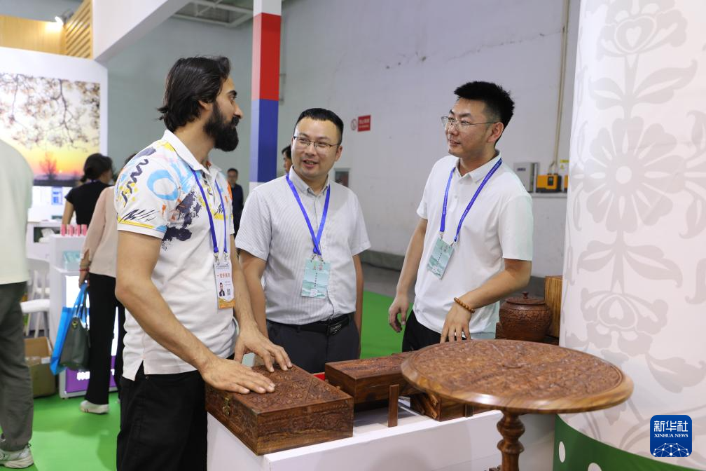 7月6日,一名巴基斯坦客商在兰洽会上向参会嘉宾推介商品。新华社记者 张智敏 摄