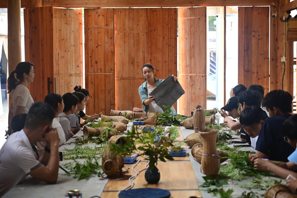 7月1日,杨成兰(中)在贵州榕江县栽麻镇丰登侗寨的工坊里向游客讲解侗布的植物染色技法。新华社发(徐凌豪 摄)