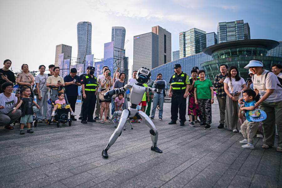 6月27日,市民在2025杭州奇妙夜活动主会场观看人形机器人表演。新华社记者 江汉 摄