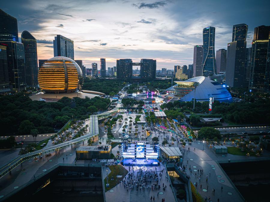 这是6月27日拍摄的位于杭州市上城区钱江新城的2025杭州奇妙夜活动主会场(无人机照片)。新华社记者 江汉 摄