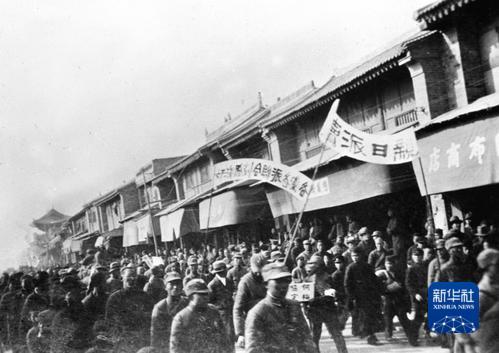 这是西安各界人民示威游行,拥护中国共产党的抗日救国主张,要求国民党政府停止内战,一致抗日。