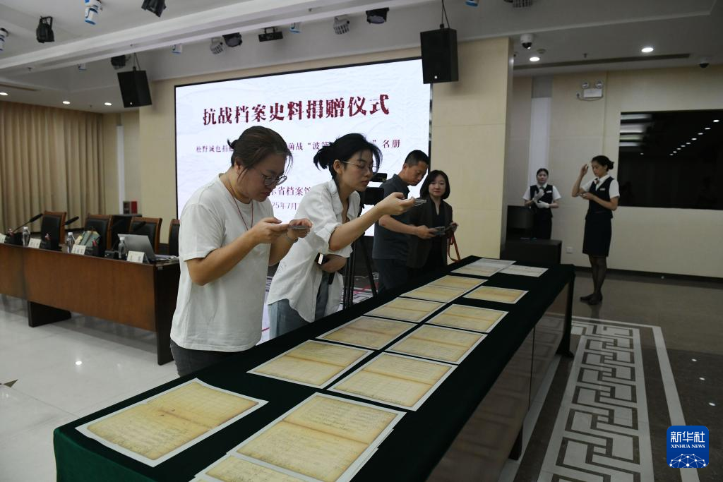 7月7日,媒体记者在广东省档案馆“抗战档案史料捐赠仪式”现场拍摄“波第8604部队”名册。新华社发(许建梅摄)