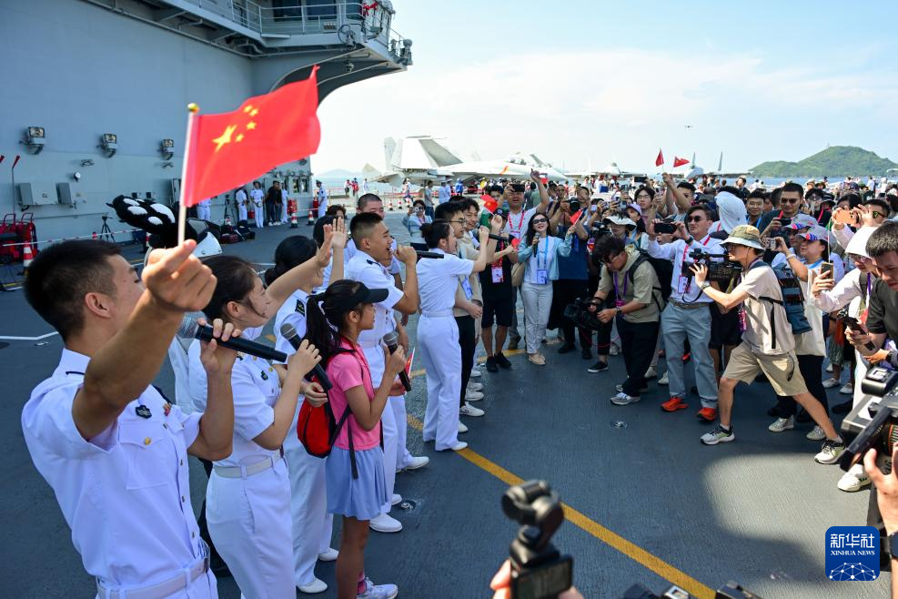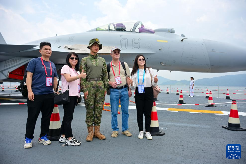 7月5日,民众在海军山东舰上留影。新华社记者 朱炜 摄