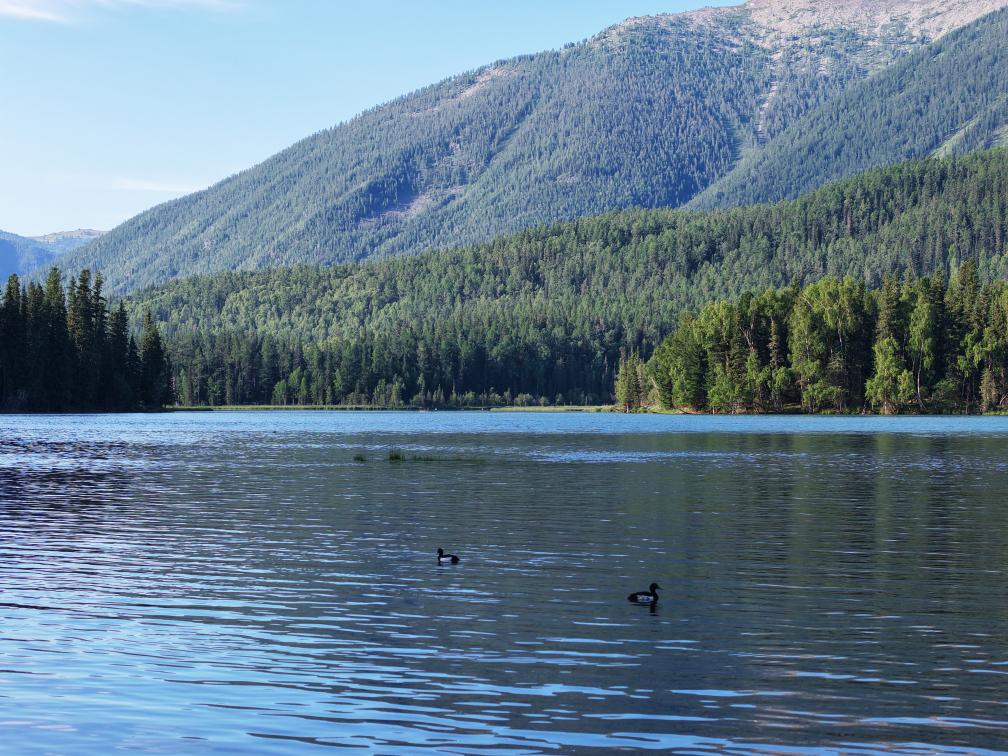 清晨,水鸟在喀纳斯河上游荡。新华社记者 张啸诚 摄