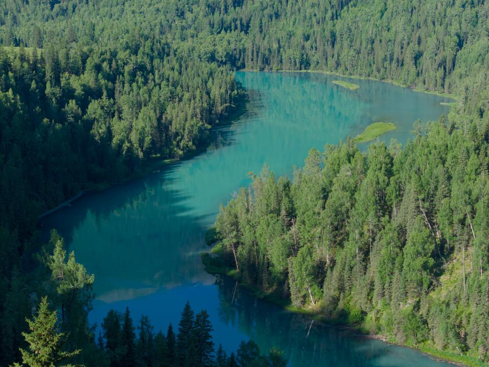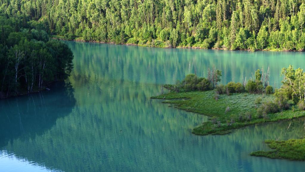 喀纳斯湖在阳光下呈现如玉般颜色。新华社记者 张啸诚 摄