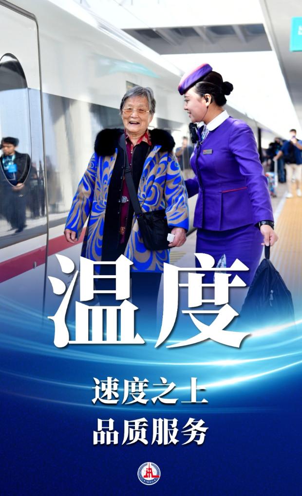 2025年1月5日,在G828次西安至香港直达高铁列车上,乘务人员为旅客介绍餐车服务情况。新华社记者 李一博 摄