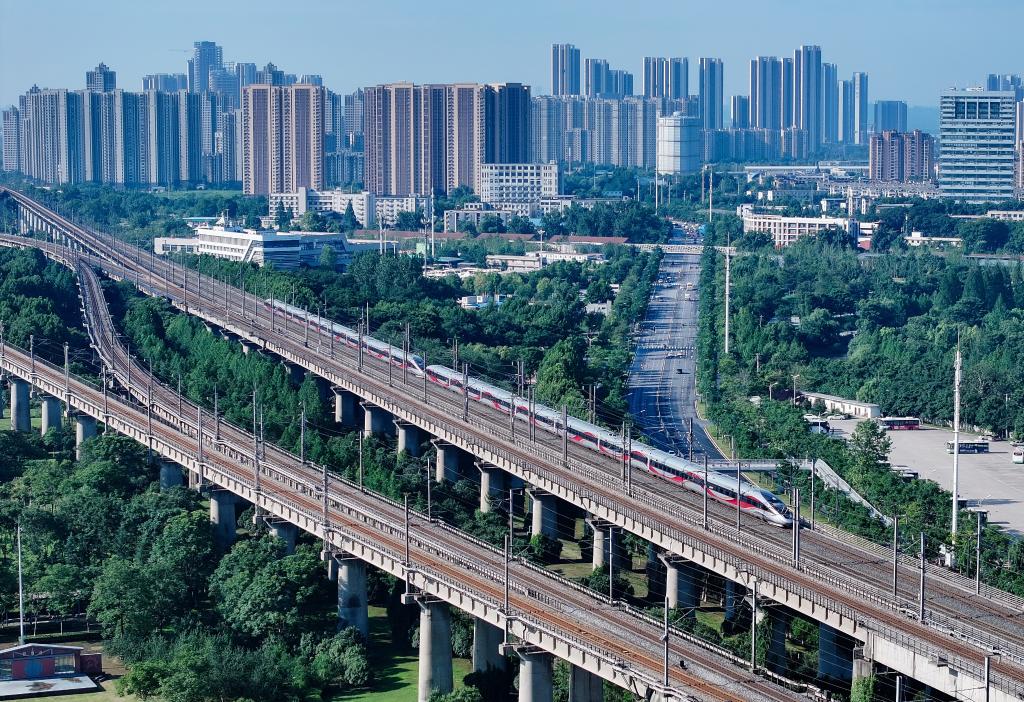 2025年6月27日,首发高铁班列驶过渝厦高铁武隆黄草乌江特大桥(无人机照片)。当日,渝厦高铁重庆东至黔江段开通运营。新华社发(宁可 摄)