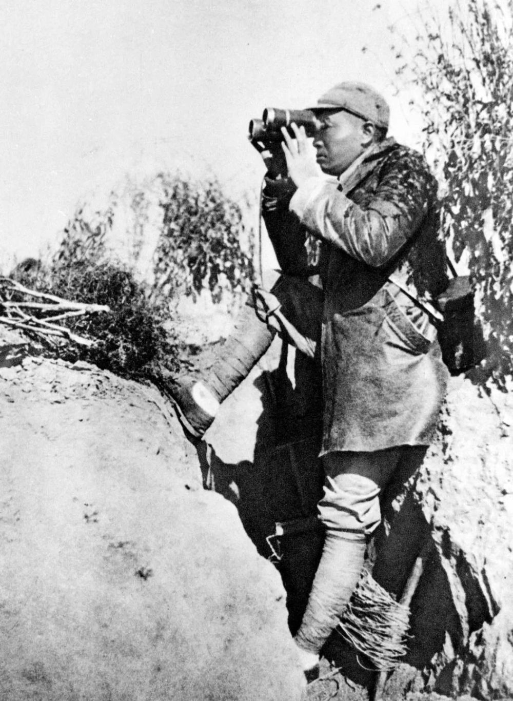 1940年,彭德怀在“百团大战”时,于山西省武乡县关家垴前线炮团哨所(距敌只有五百米)观察敌情,指挥战役。新华社发