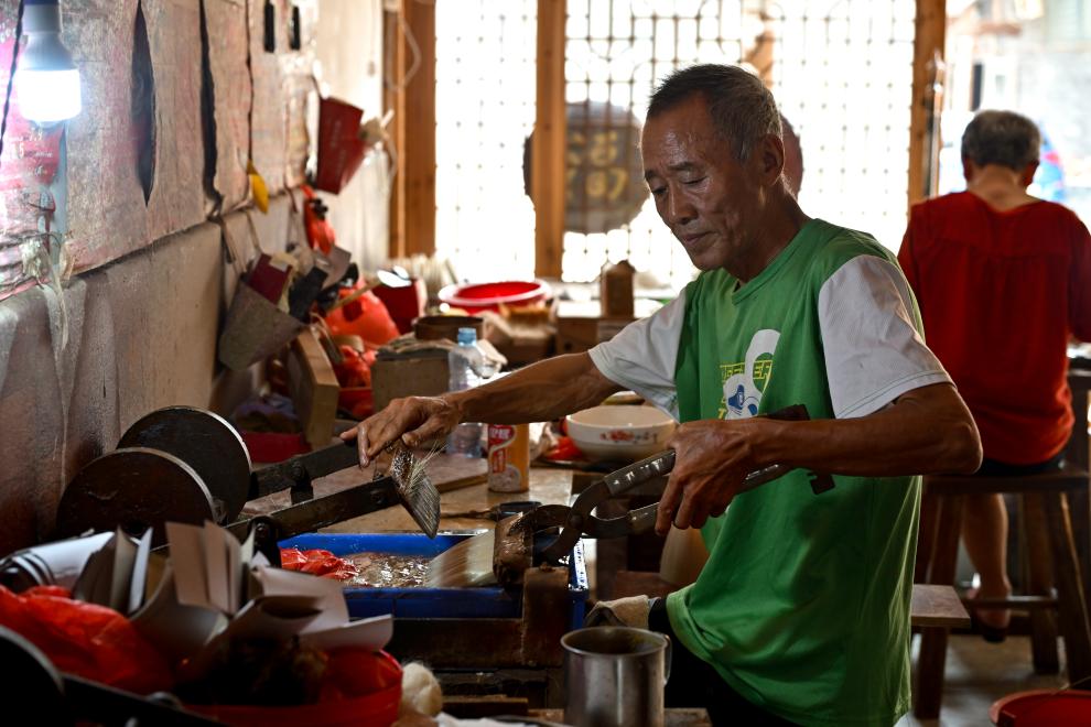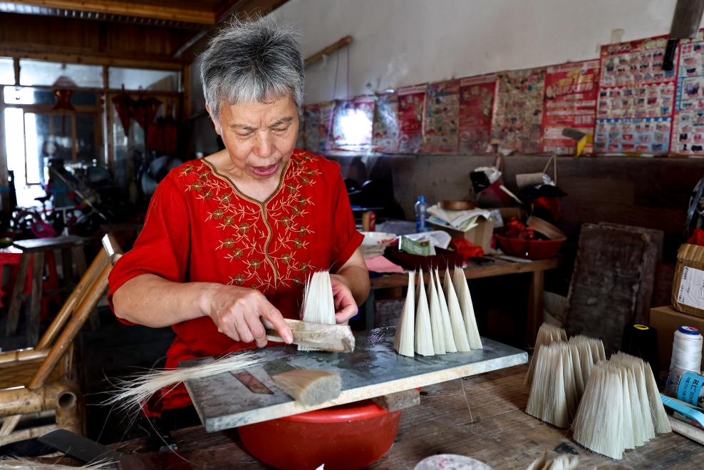 7月8日,在江西省南昌市进贤县文港镇,制笔师傅在制作毛笔。