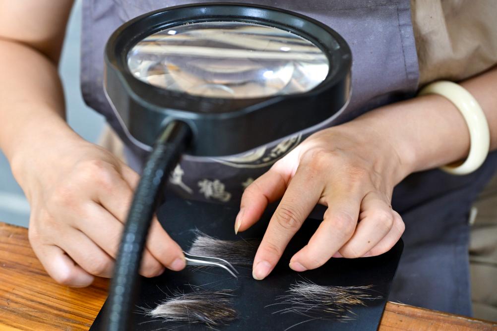 7月8日,制笔工匠在中国毛笔文化博物馆内展示传统毛笔制作技艺。