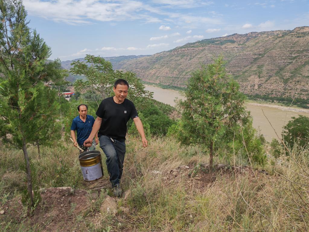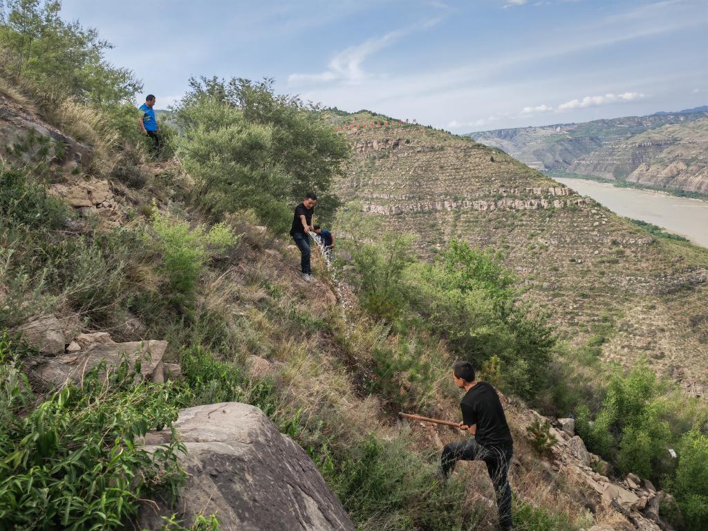 黄河西岸,一处斜坡近百米高,坡度近50度,土质松软,人踩上去有些站不稳。队员郝雷拎起锄头,小心翼翼地下到斜坡中间地带,给一棵棵长势苍翠的白皮松掏土、堆坑。另一边,同伴们接好水管,拧开阀门,一股股清流“告别”停在坡顶的拉水车,沿着20多米的管道,渗进了树苗根部。“今年陕北雨少天旱,我们得多浇几次水,争取让每棵树都能活下来。”郝雷说。