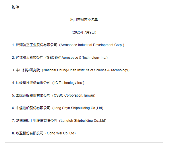 商务部公告2025年第35号 公布将8家台湾地区实体列入出口管制管控名单