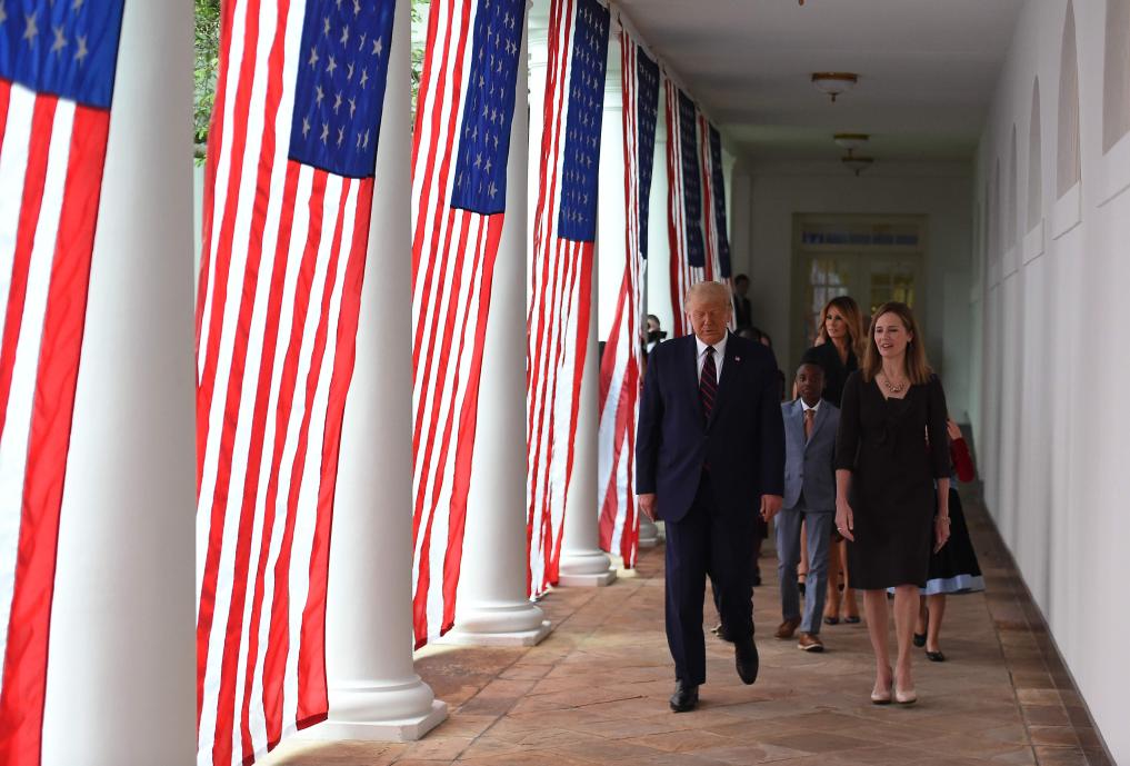 2020年9月26日,在第一任期的美国总统特朗普(前左)和时任美国联邦第七巡回上诉法院法官艾米·科尼·巴雷特(前右)出席在白宫举行的提名公布活动。新华社/法新