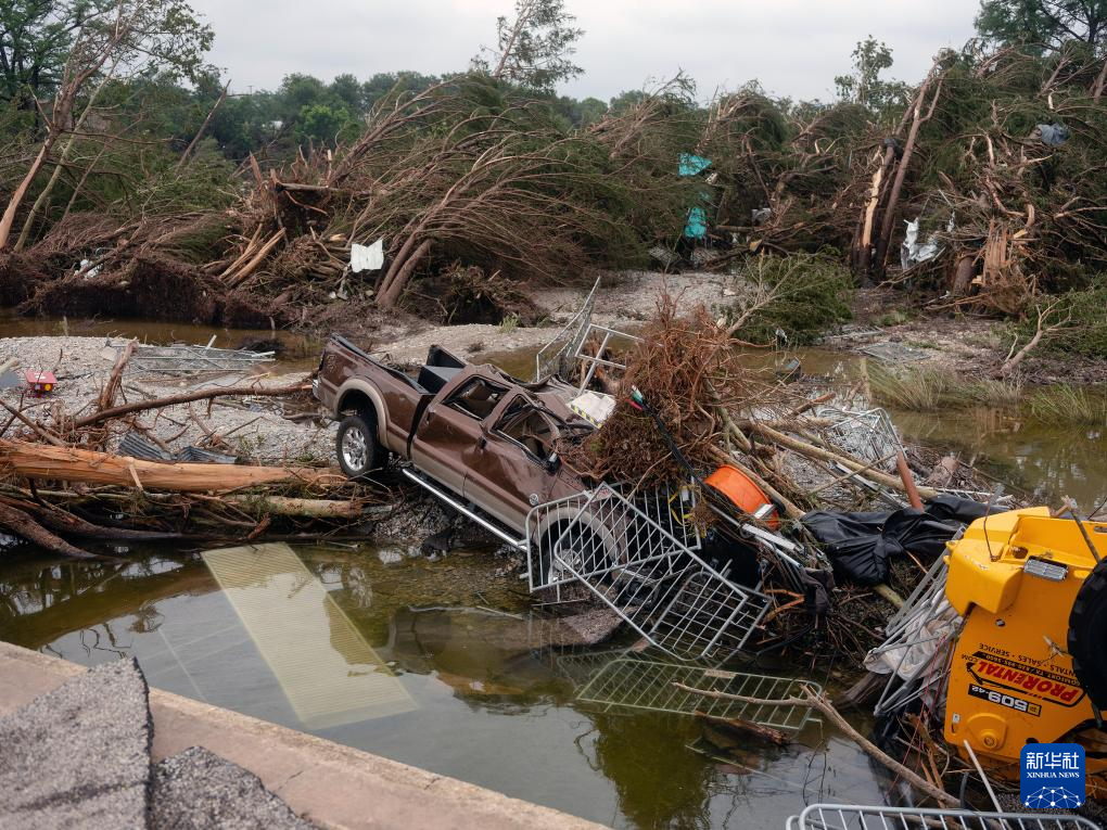 这是7月5日在美国得克萨斯州克尔维尔拍摄的被洪水毁坏的车辆。新华社发(布伦达·巴赞摄)