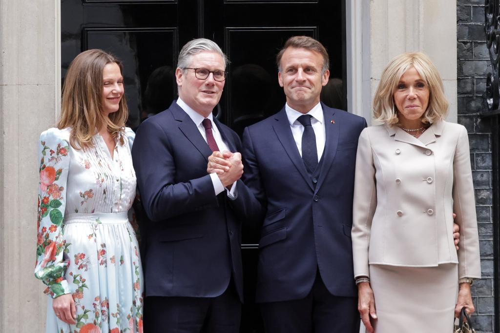 7月9日,英国首相斯塔默(左二)和夫人(左一)在英国伦敦唐宁街10号首相府前迎接法国总统马克龙(右二)和夫人。新华社发