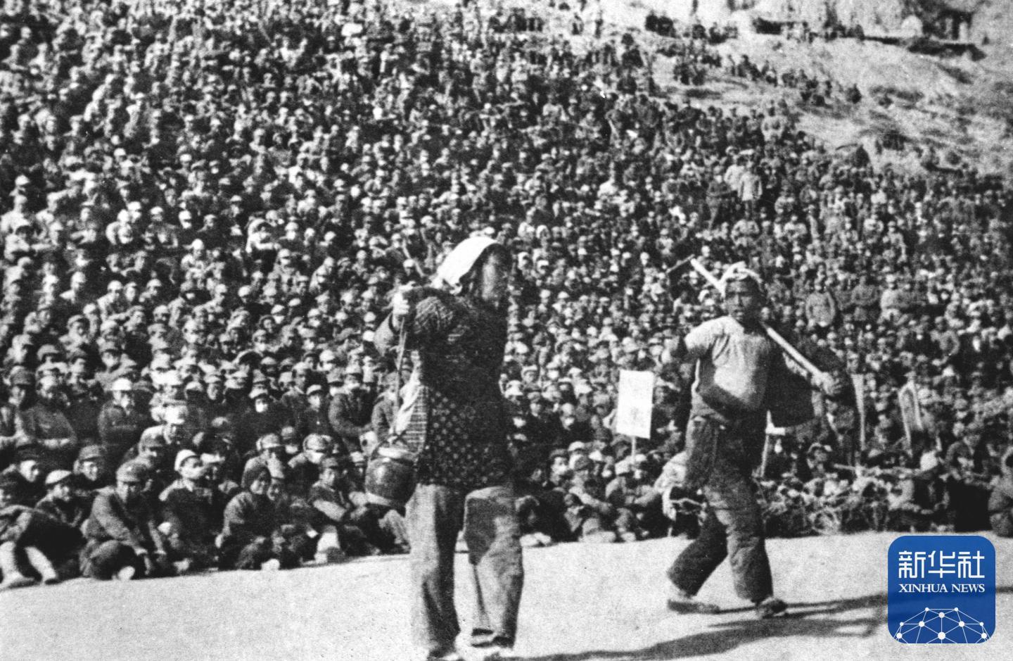 1943年2月,陕西延安鲁迅艺术学院学生王大化、李波(前左)为军民演出秧歌剧《兄妹开荒》。