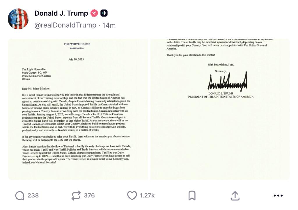 特朗普在信中称,若加拿大决定提高对美关税水平,无论增加税额是多少,美国将在上述35%关税基础上对等增加。