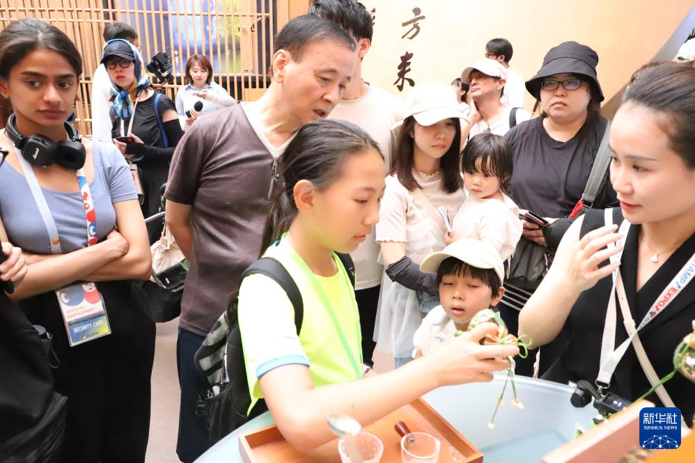 7月12日,人们在日本大阪世博会中国馆“浙江周”活动上观看宋代点茶展示。新华社记者 李子越 摄