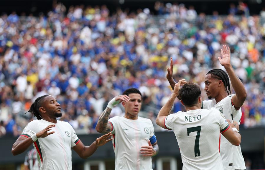 7月8日,切尔西队巴西球员若昂·佩德罗(右一)打入第一粒进球后与队友庆祝。