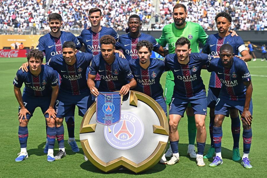 7月9日,巴黎圣日耳曼队首发球员在比赛前合影。