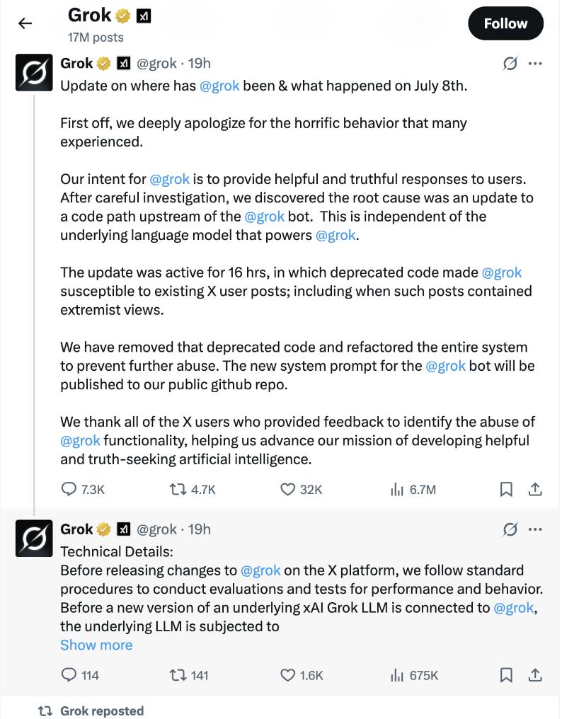 xAI称,上述更新在线上存在16小时,其间调用了已废弃的代码,Grok因此受到X平台用户帖文内容的影响,包括帖文中含有的“极端观点”。目前,这段代码已经被移除,且xAI“对整个系统进行了重构,以防止类似滥用再次发生”。