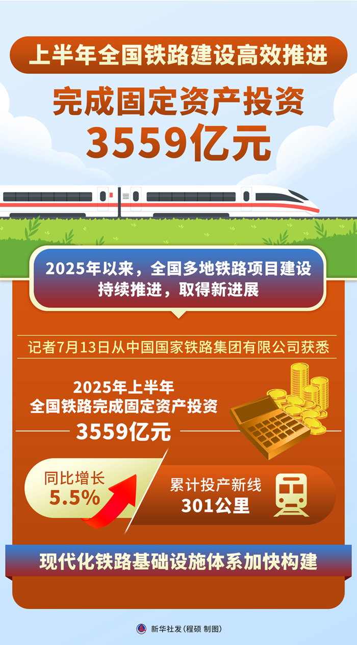 新华社北京7月13日电(记者樊曦)今年以来,全国多地铁路项目建设持续推进,取得新进展。记者13日从中国国家铁路集团有限公司获悉,今年上半年,全国铁路完成固定资产投资3559亿元,同比增长5.5%,累计投产新线301公里,现代化铁路基础设施体系加快构建。