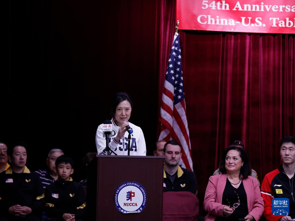 7月13日,美国乒协首席执行官沈伟妮在美国内华达州拉斯维加斯举办的纪念中美“乒乓外交”54周年暨中美乒乓球友好交流活动上致辞。新华社发(邱晨摄)
