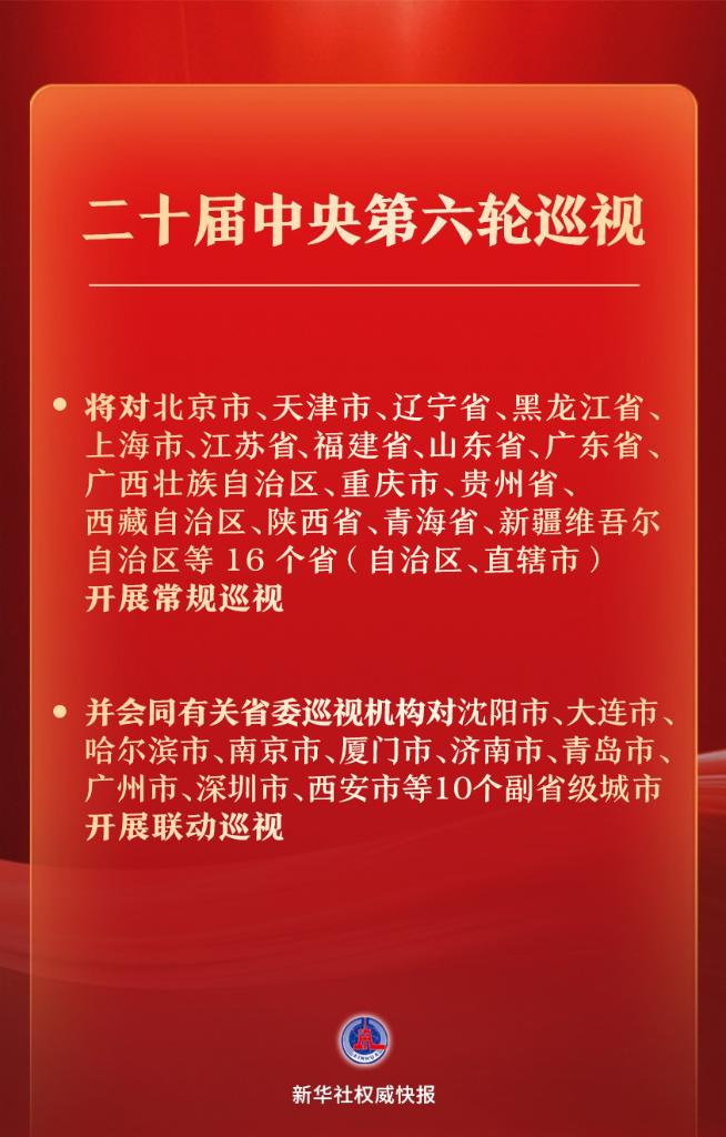 经党中央批准,二十届中央第六轮巡视将对北京市、天津市、辽宁省、黑龙江省、上海市、江苏省、福建省、山东省、广东省、广西壮族自治区、重庆市、贵州省、西藏自治区、陕西省、青海省、新疆维吾尔自治区等16个省(自治区、直辖市)开展常规巡视,并会同有关省委巡视机构对沈阳市、大连市、哈尔滨市、南京市、厦门市、济南市、青岛市、广州市、深圳市、西安市等10个副省级城市开展联动巡视。