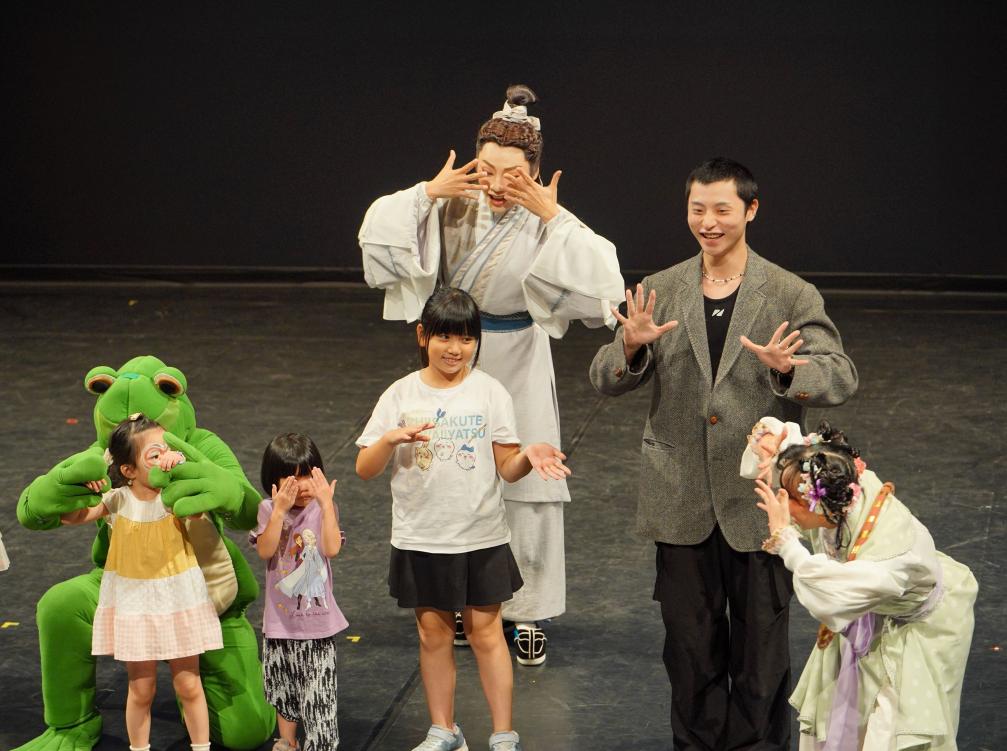 7月15日,唐美云歌仔戏团在记者会上邀请小朋友上台互动。新华社发