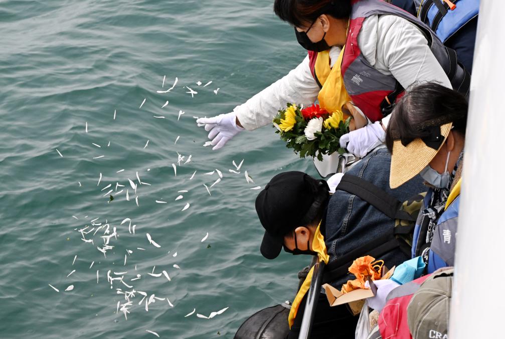 2024年3月28日,山东青岛众多生态海葬逝者的亲属乘船出海参加海上追思活动。新华社记者 李紫恒 摄