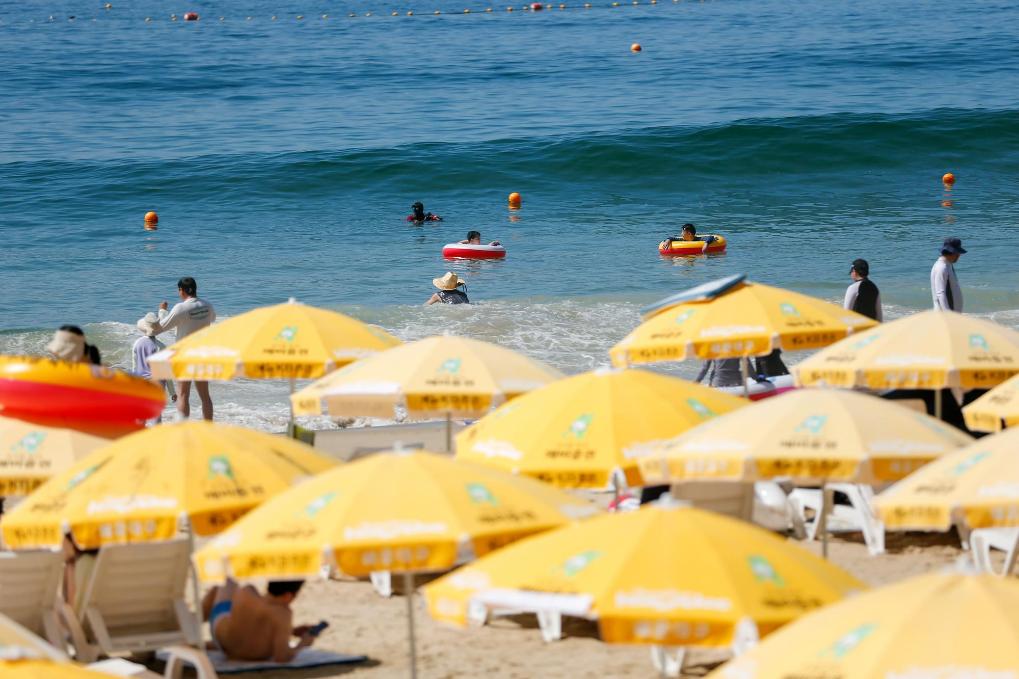 2023年8月3日,市民在韩国釜山的海滩消暑。新华社记者王益亮摄