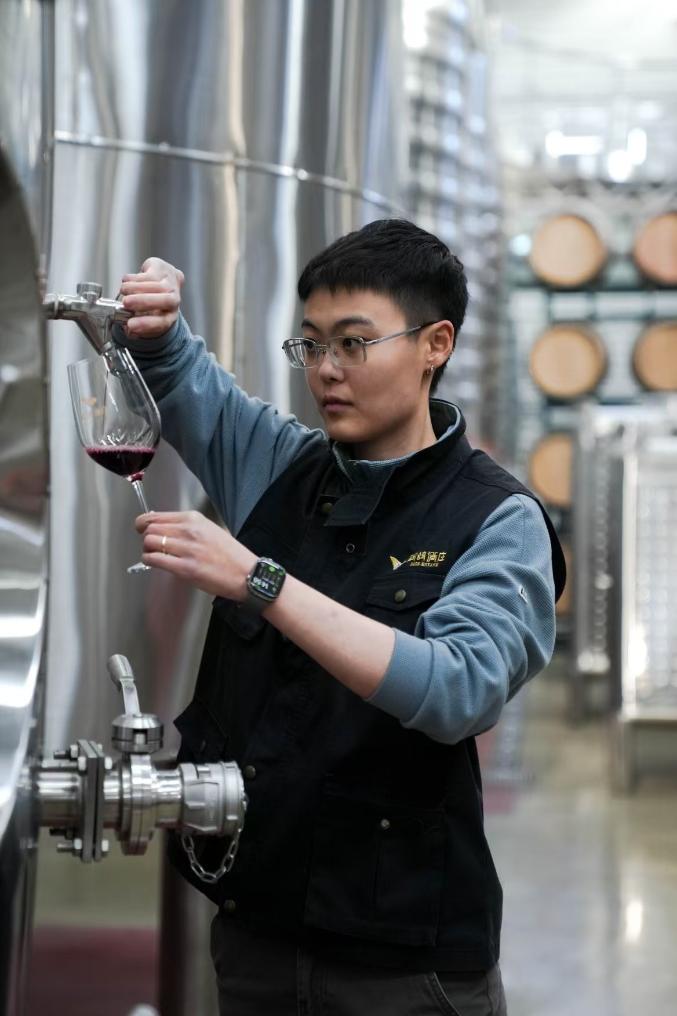 西鸽酒庄助理酿酒师王斐在酿造车间工作。(受访者供图)