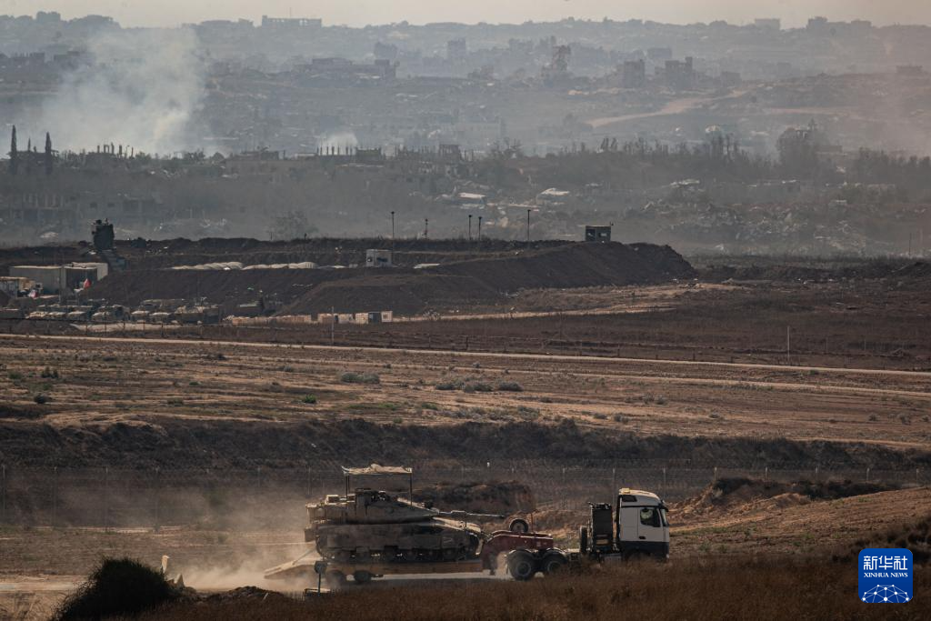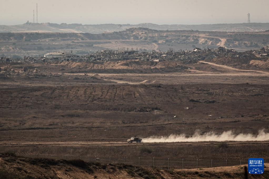 这张7月10日在以色列与加沙边境以色列一侧拍摄的照片显示,以军车辆行驶在加沙地带境内。 新华社记者 陈君清 摄
