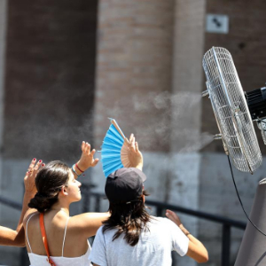 2025年6月27日,在意大利罗马,游客在斗兽场附近一处风扇下纳凉。6月27日至29日,罗马、米兰、佛罗伦萨、威尼斯等12个意大利城市发布连续三日高温红色预警。新华社记者李京摄