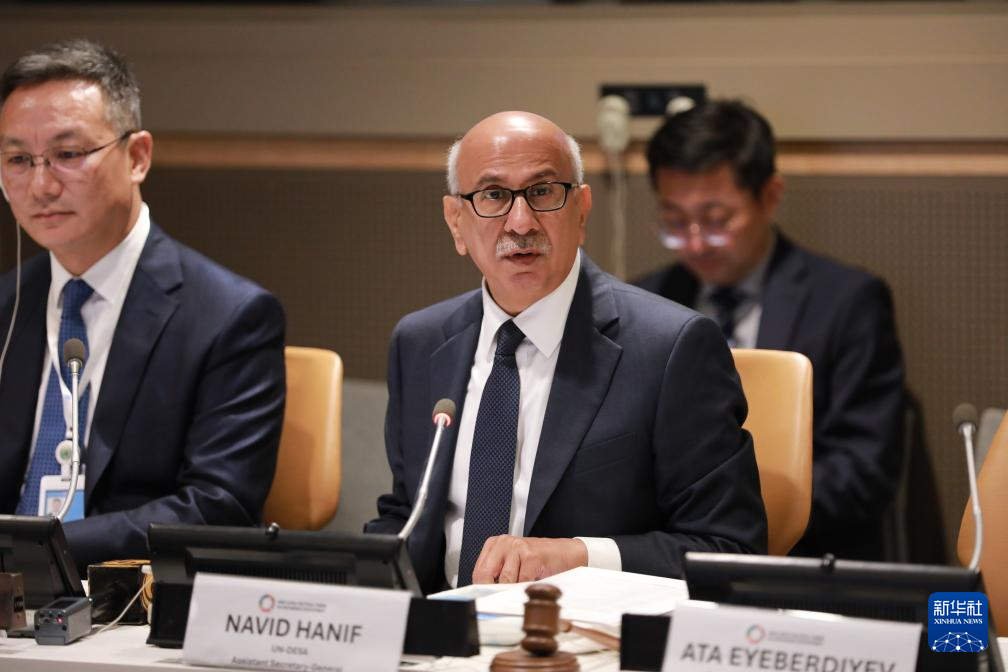 7月16日,在位于纽约的联合国总部,联合国助理秘书长哈尼夫(前右)在“2025全球可持续交通最佳实践案例集”发布活动上致辞。 新华社记者 谢锷 摄
