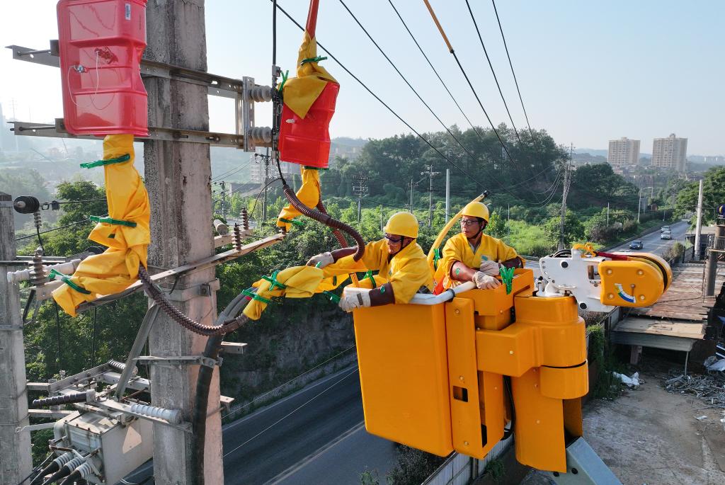 7月15日,国网北碚供电公司工作人员在10千伏翡同线开展旁路作业带电更换隔离开关。(受访单位供图)